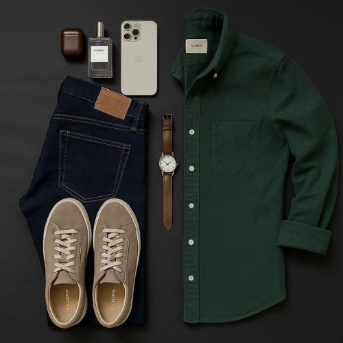 • Outdoor Vibes: Olive green shirts with khaki or beige pants.